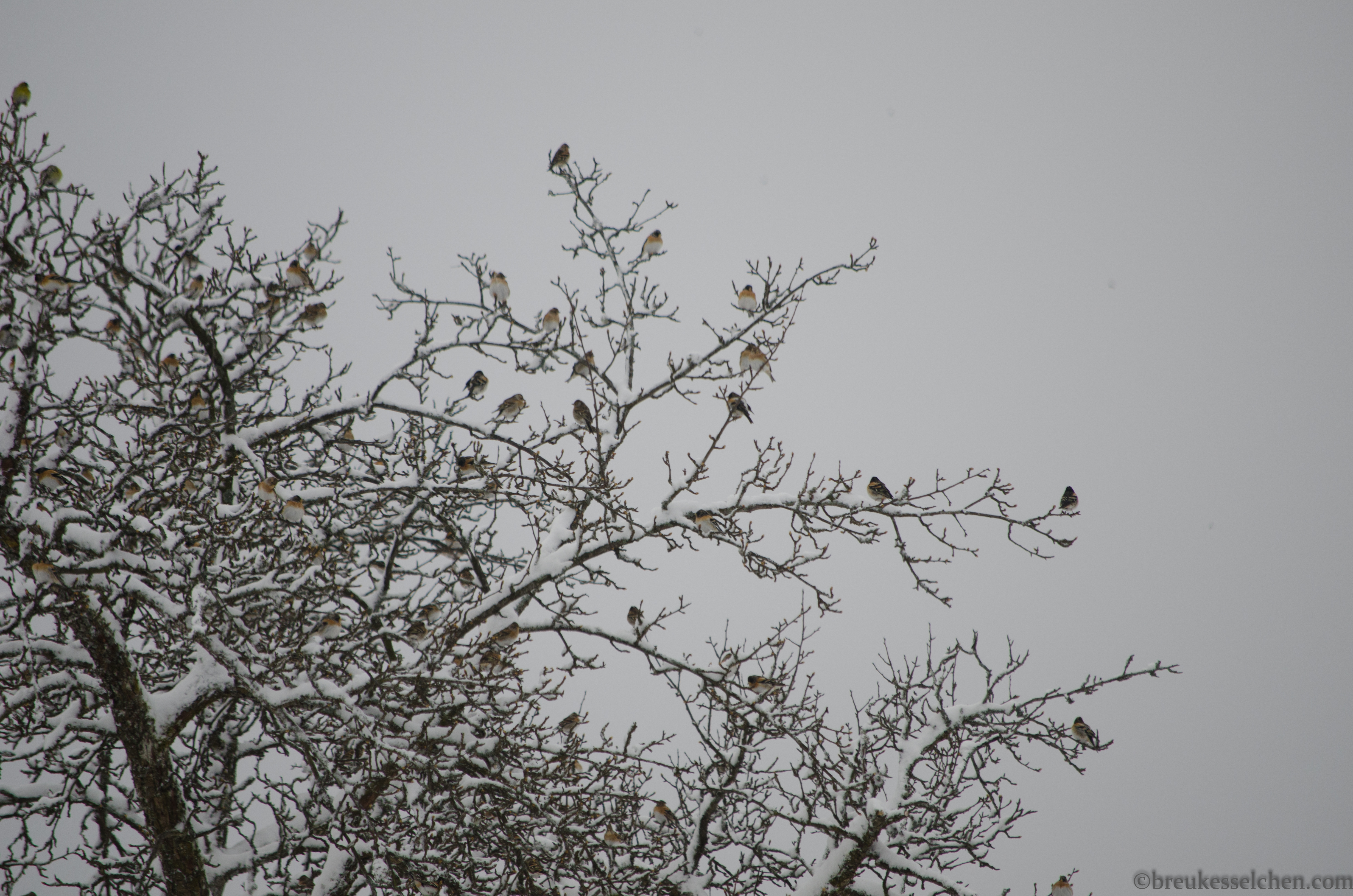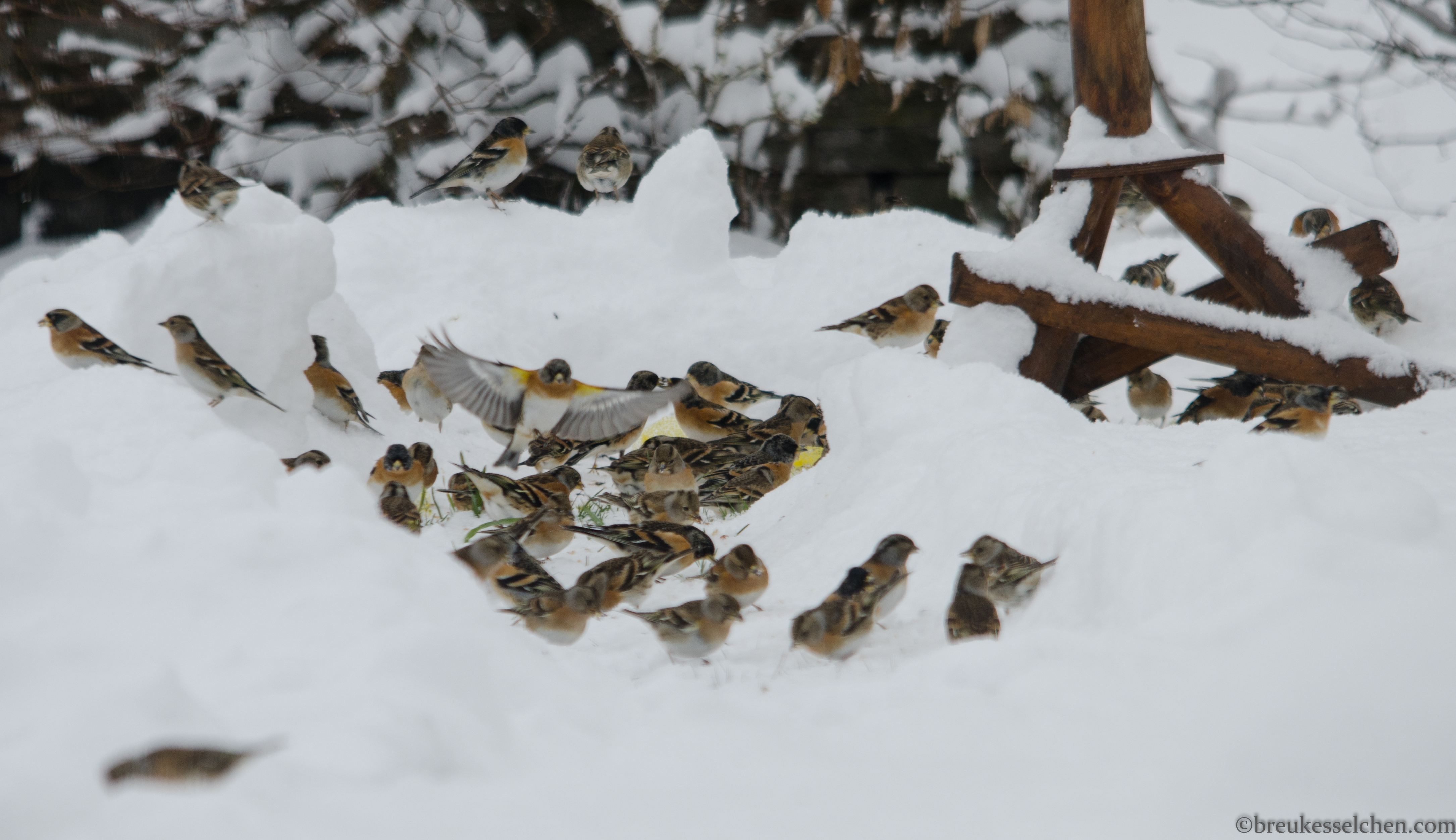 Doch bevor ich euch schöne Ostern wünsche muss ich euch unbedingt von dem plötzlichen Schneefall gestern berichten. Denn der hat meine Gartenvögelchen doch sehr überrascht. Es war kein Aprilscherz! Selbst ich war überrascht. Also holte ich die Schneefräse wieder raus und räumte unsere Auffahrt frei. Nachdem ich noch etwas Vogelfutter ins Vogelhäuschen und unter die Hecke gestreut hatte, kamen auf einmal ganz viele Bergfinken an. Mindestens 30 auf einmal! Ungelogen! Seht selbst. Wie eine kleine Invasion!