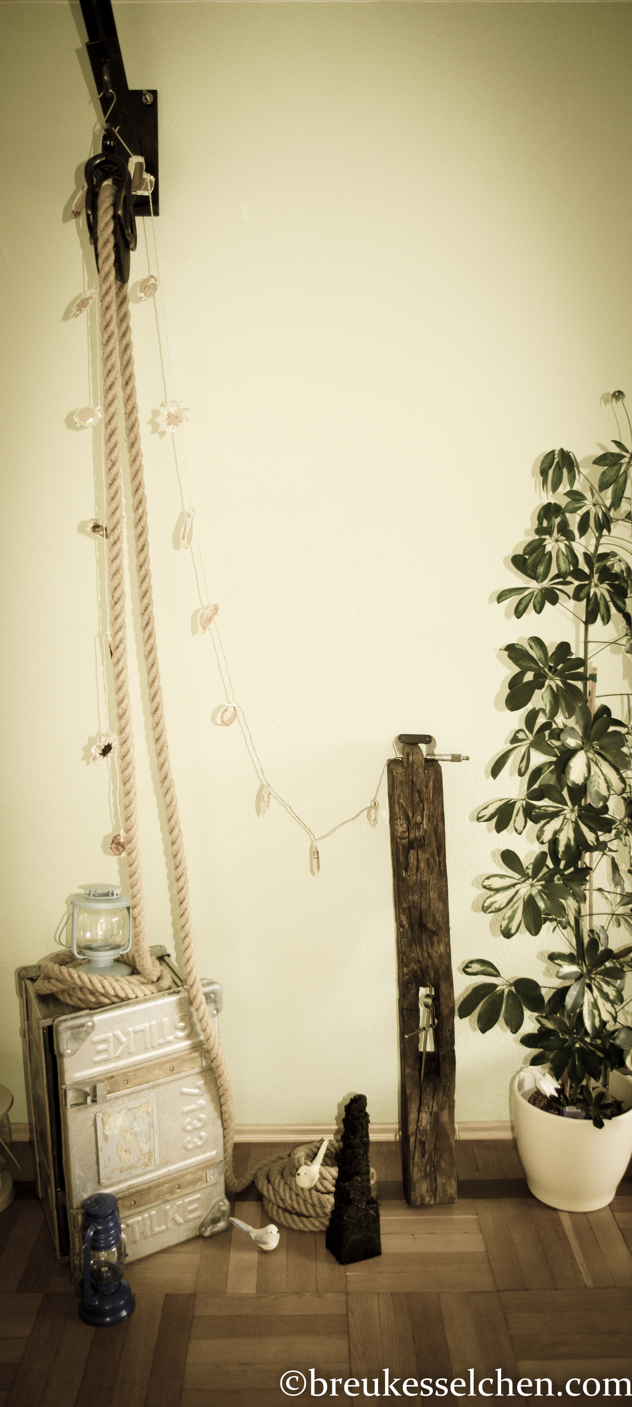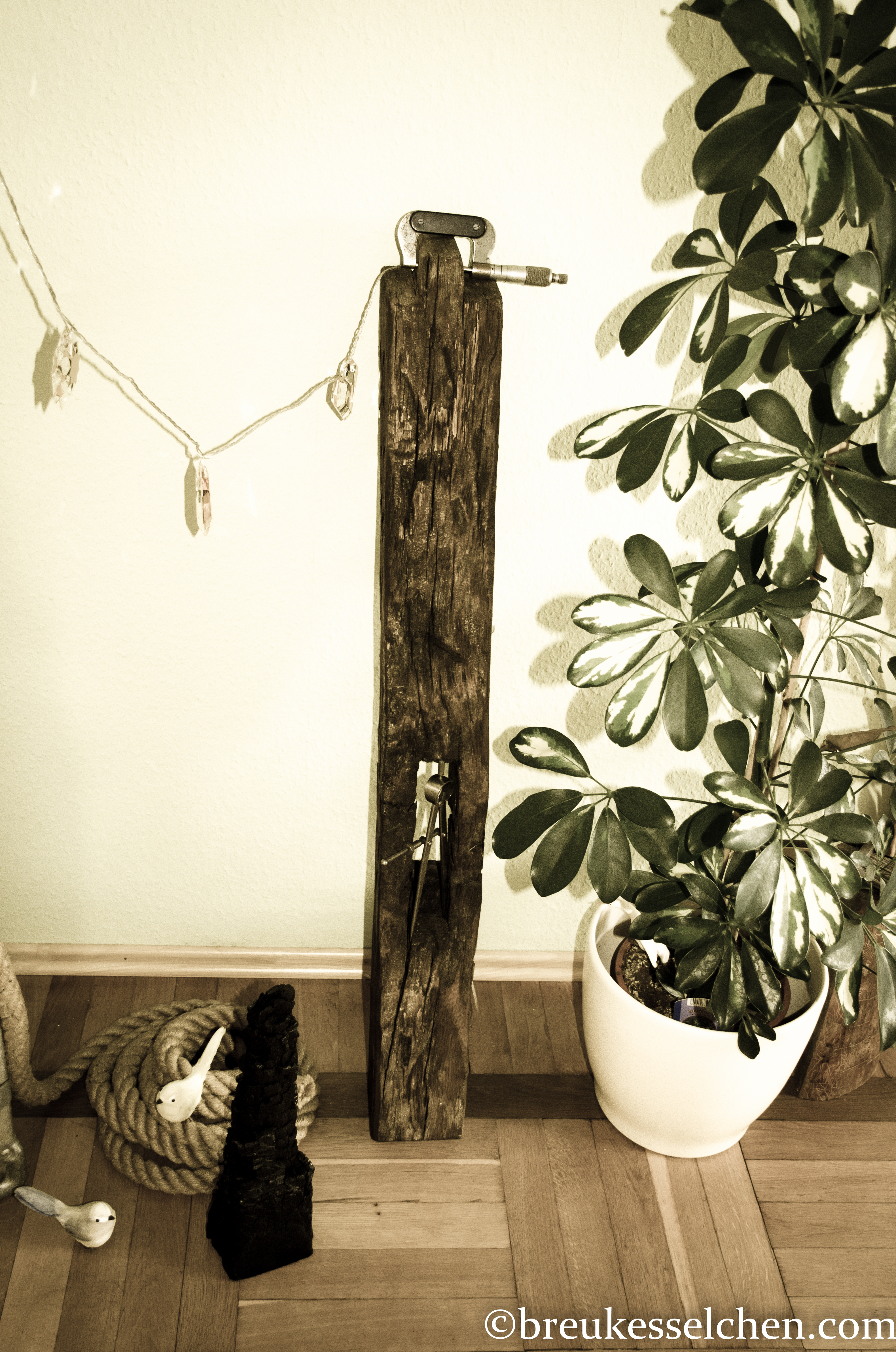 Ich bin jedenfalls sehr zufrieden mit dem Balken. Und so lässig an die Wand gelehnt, macht er sich wirklich toll im Wohnzimmer. Es gibt dem Raum eine gewisse Wärme und Gemütlichkeit! Ich liebe solche Dekoration! Ich kann sie immer wieder neu anordnen, dekorieren oder umstellen. Schwuppdiwupp, erledigt. 😉
