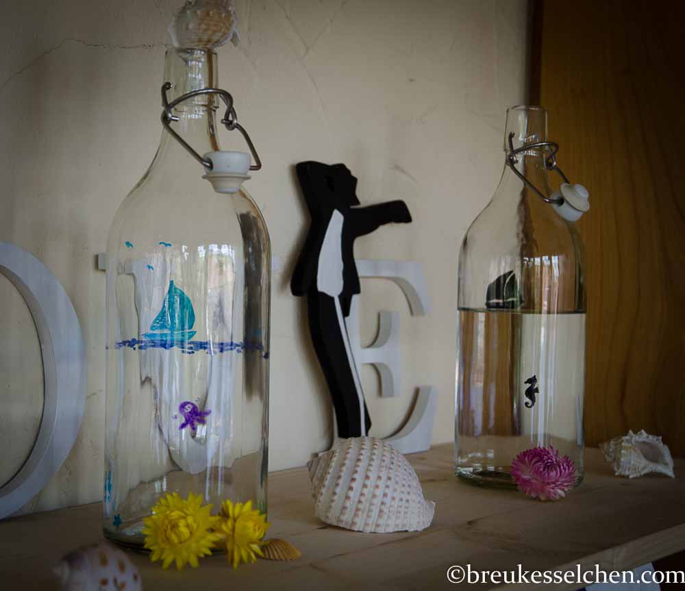 Da saß ich nun auf unserer Terrasse, mit einigen kleinen Ideenvorlagen für Motive verteilt und hatte diese Glasmalstifte (oder besser gesagt: Porzellanstifte) in der Hand. Eigentlich wollte ich die von Marabou kaufen, da diese nicht noch extra im Ofen „gebrannt“ werden müssen. Doch am Ende habe ich mich für die Farbpalette von edding entschieden. Ging online schneller und war etwas preisgünstiger. Und um ehrlich zu sein, verzichte ich auf das Einbrennen. Wird schon so halten. 🙂 Schließlich sind die Glasflaschen eher als Deko gedacht, als für den Gebrauch.